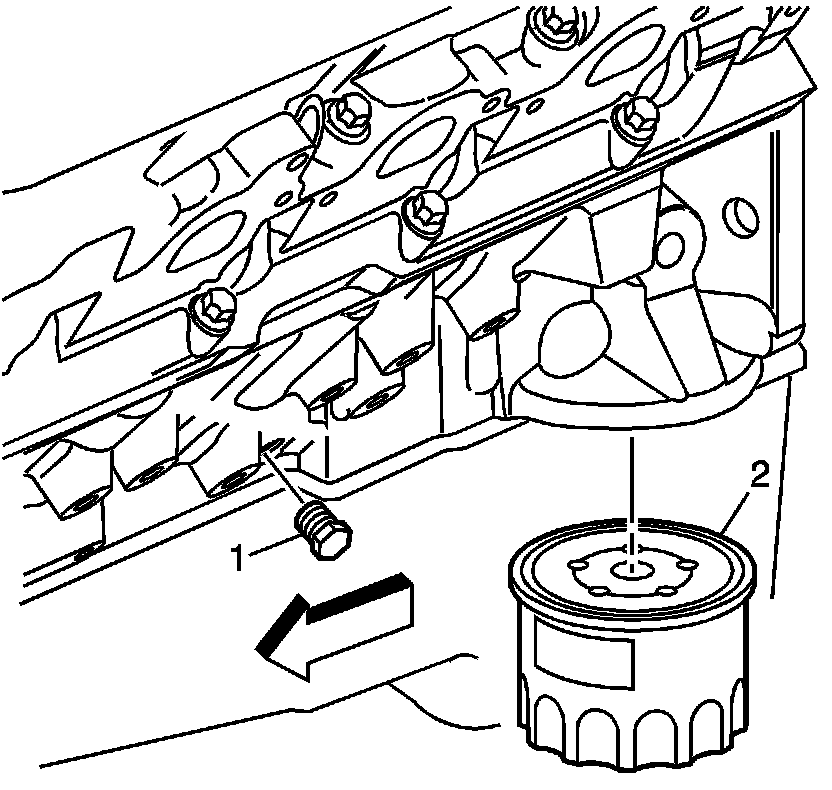 4. Remove the oil filter (2) from the engine block and allow the engine oil to drain completely.