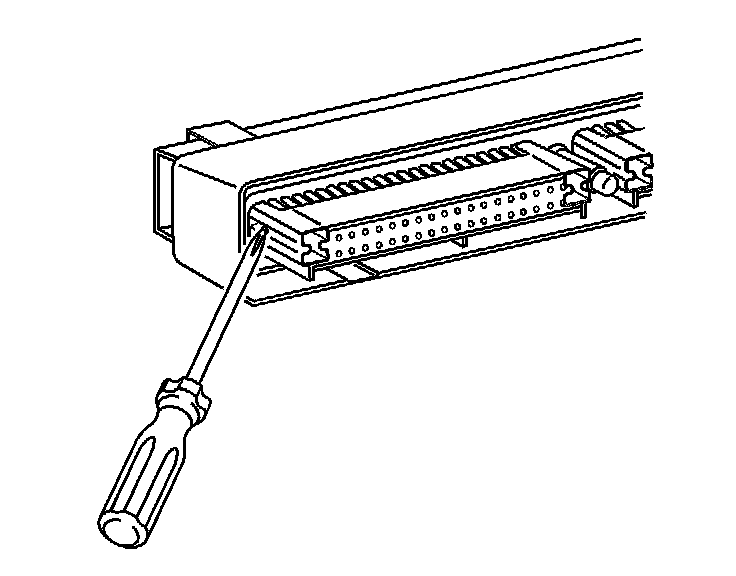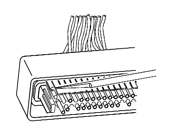 9. Use J 38125-12A to gently lift the terminal retaining tab while gently pulling the wire out of the back of the connector. Always remember never use force when pulling a terminal out of a connector. If the terminal is severely bent or damaged, it may be possible on some connectors to push the wire out of the front of the connector instead of pulling it through. This will prevent damage to the internal seals of the connector. Once the terminal is pushed out of the connector, cut the wire as close to the terminal as possible and pull the wire through the connector.