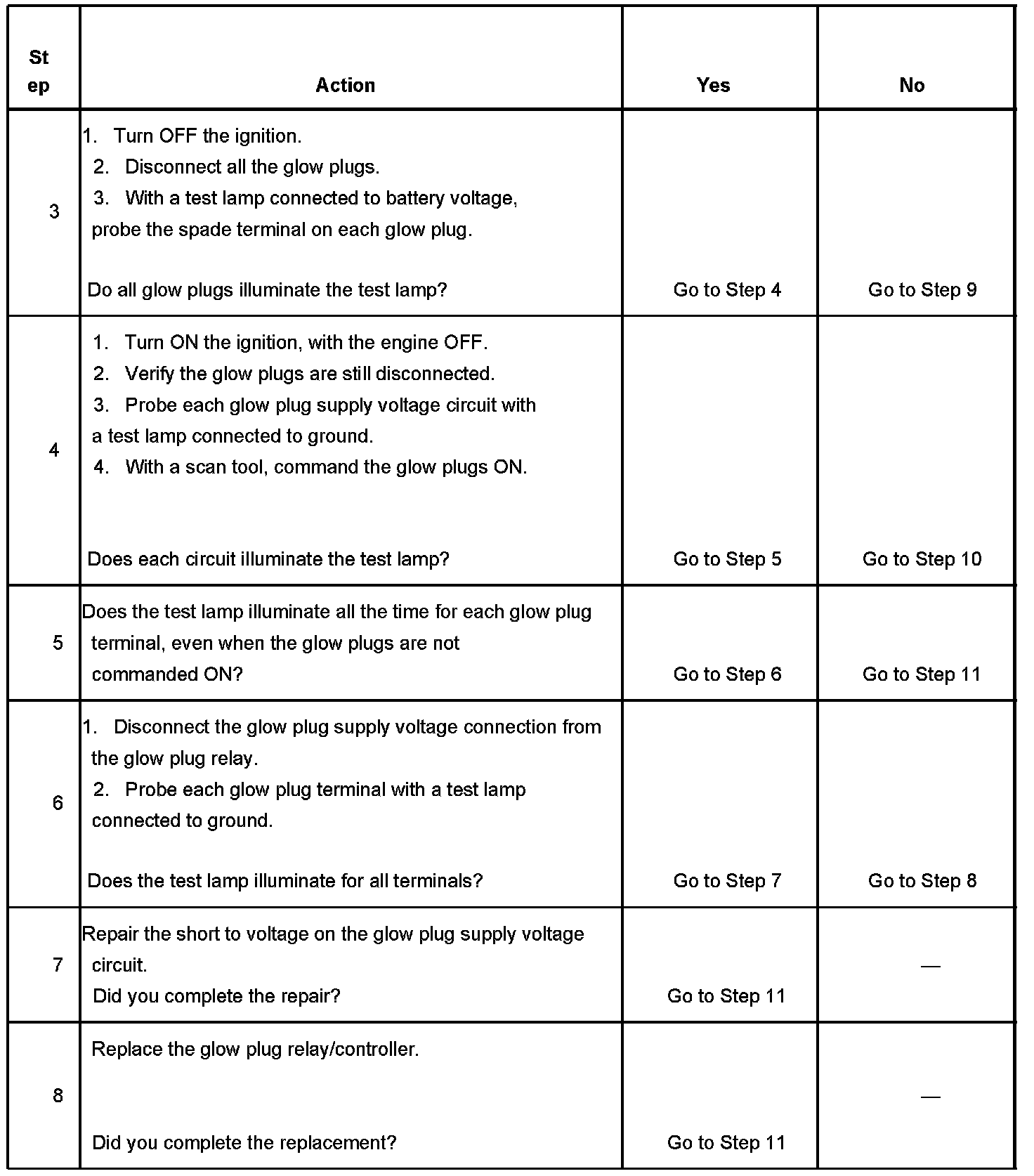 4. This step will check each glow plug feed circuit for an open.