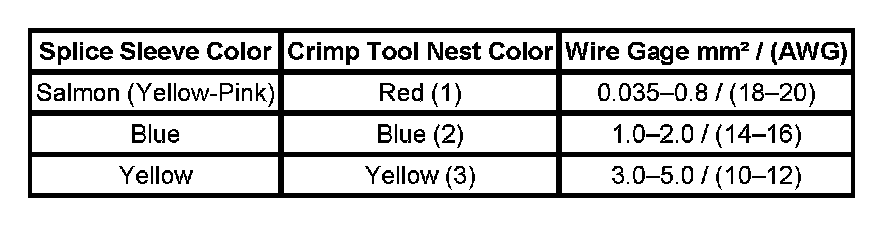 4. Select the proper sealed splice sleeve according to the wire size. Refer to the above table at the beginning of the repair procedure for the color coding of the splice sleeves and the crimp tool nests.