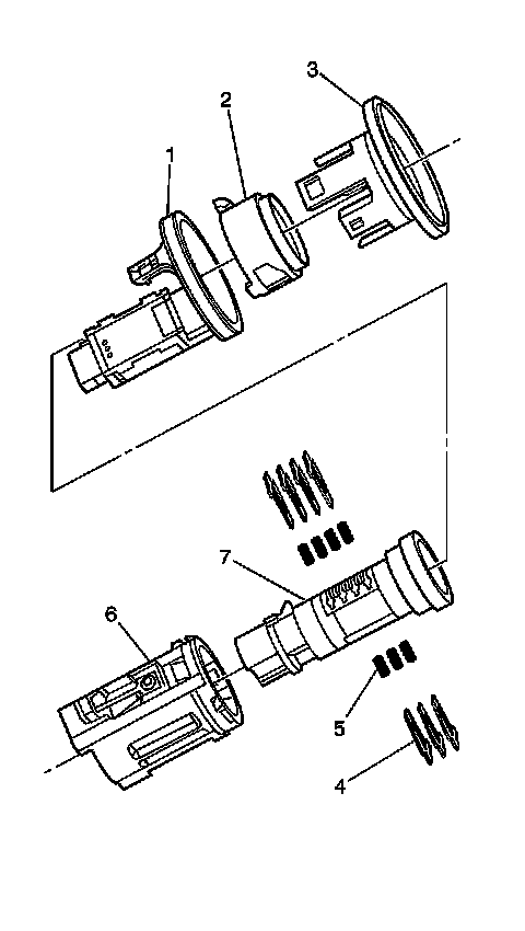 6. Check for correct loading of the tumblers (4) by inserting the key into the cylinder (7). All of the tumblers should be flush with the lock cylinder.
