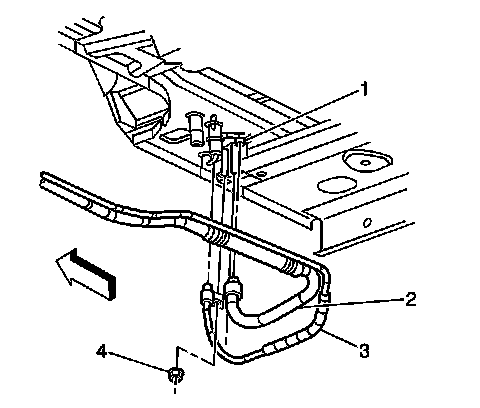 4. Disconnect the heater lines (2,3) from the auxiliary HVAC module at the underside of the vehicle.