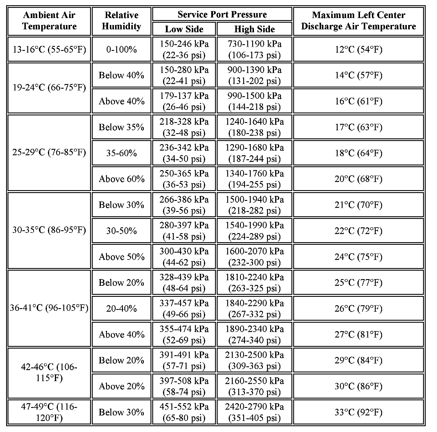 A/C Performance Table - With Rear A/C