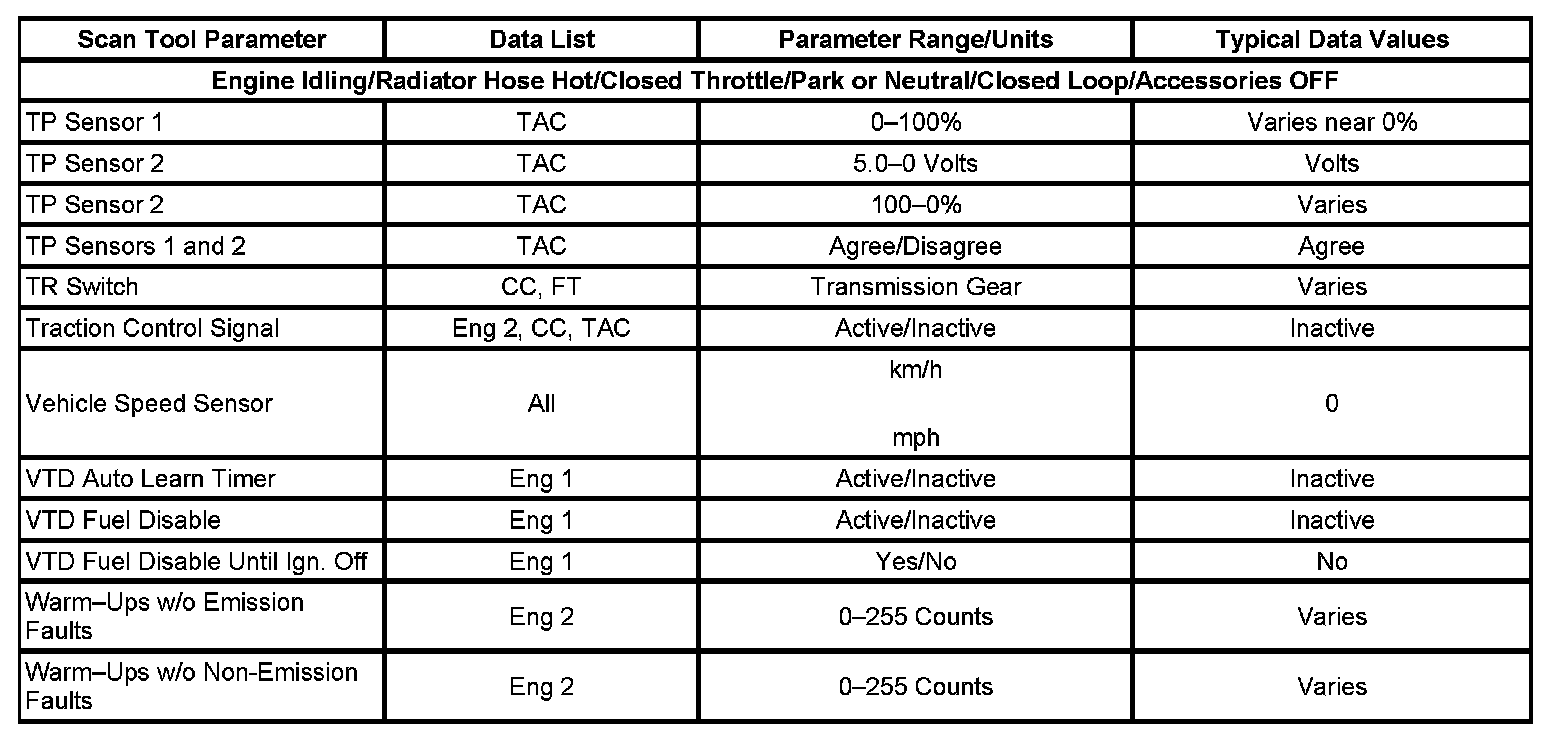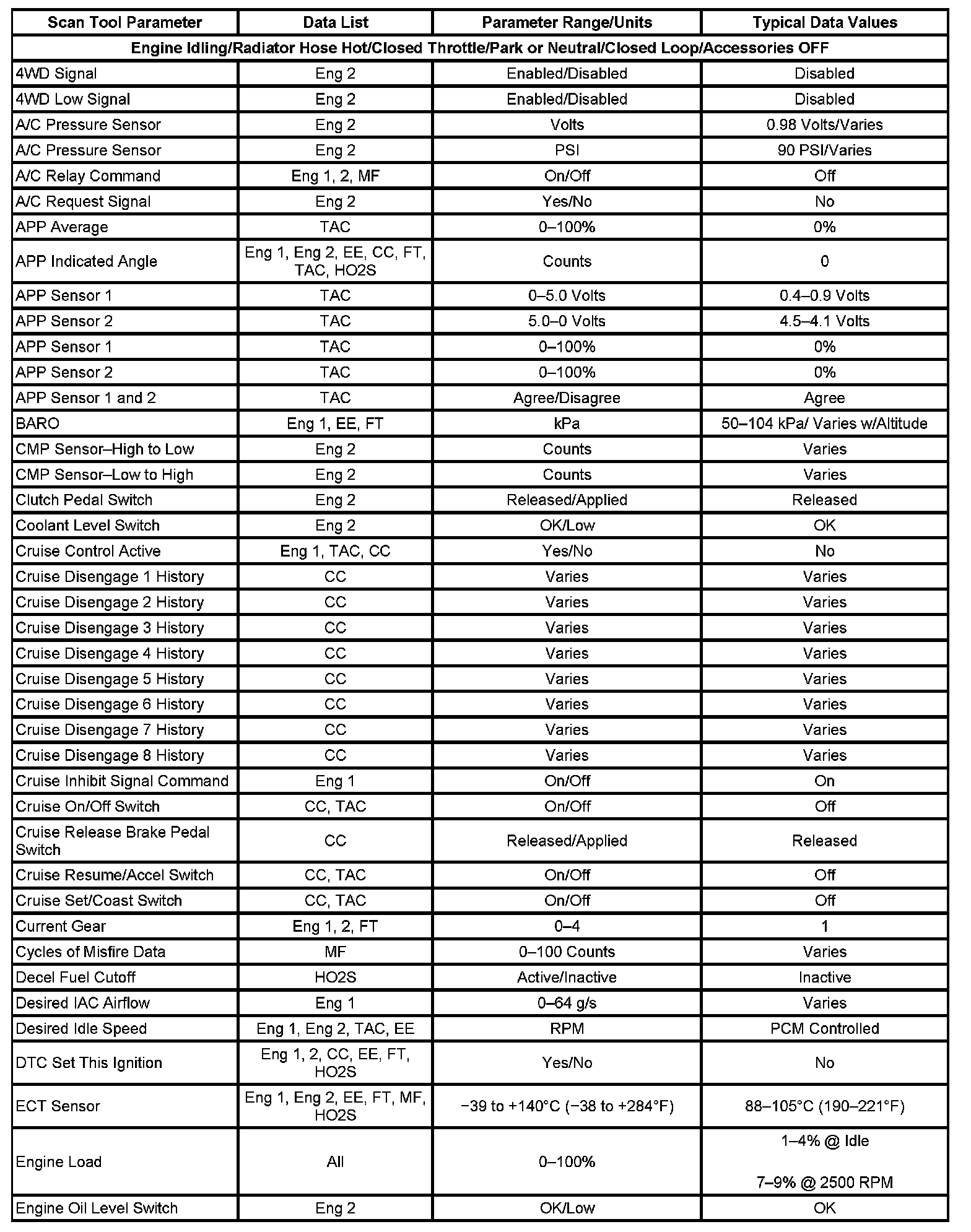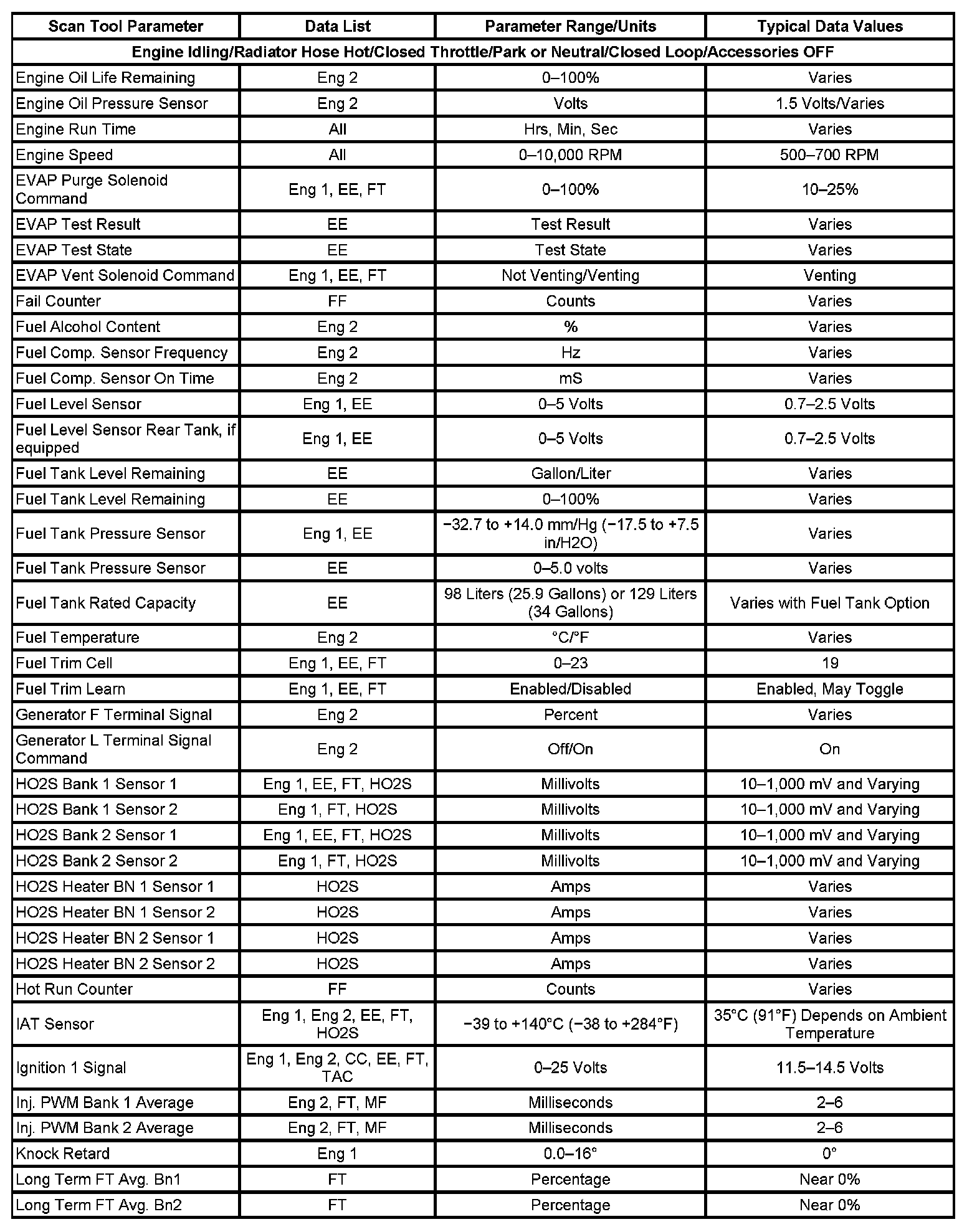 The Engine Scan Tool Data List contains all engine related parameters that are available on the scan tool. The list is arranged in alphabetical order. A given parameter may appear in any one of the data lists, and in some cases may appear more than once, or in more than one data list in order to group certain related parameters together.