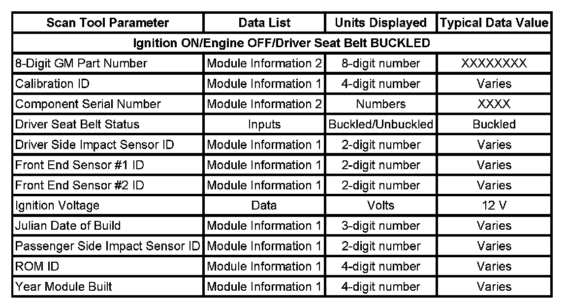 Use the SIR Scan Tool Data List as directed by a diagnostic table or to supplement the diagnostic procedures. Begin all of the diagnostic procedures with the Diagnostic System Check - Restraint Systems. Refer to the Diagnostic System Check - Restraint Systems. Use the SIR Scan Tool Data List after determining the following: