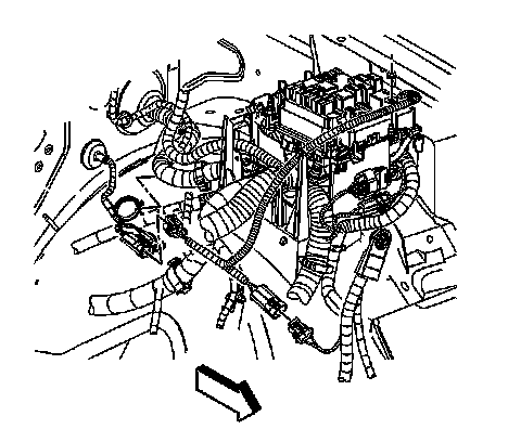 8. If equipped with a 4.8L, 5.3L, or 6.0L engine, position the negative cable and engine wiring harness ring terminals to the engine block. Position the anti-rotation tab on the negative cable in the correct location.