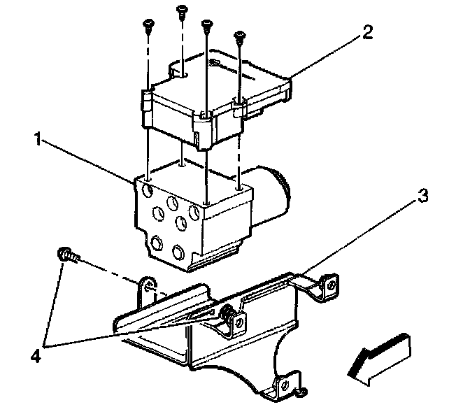 6. Gently move the EHCU down enough to remove the four mounting screws that fasten the EBCM (2) to the BPMV (1).