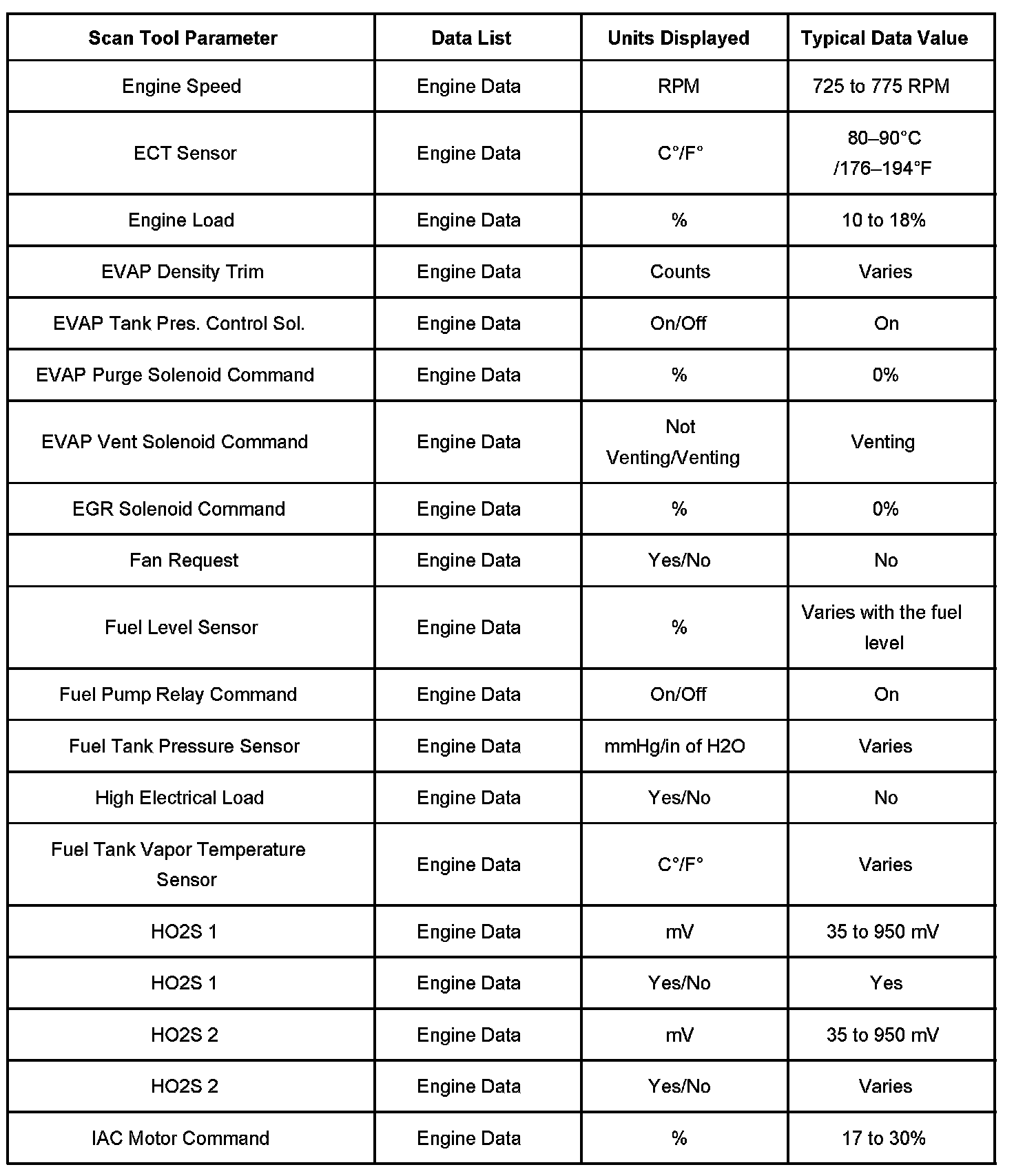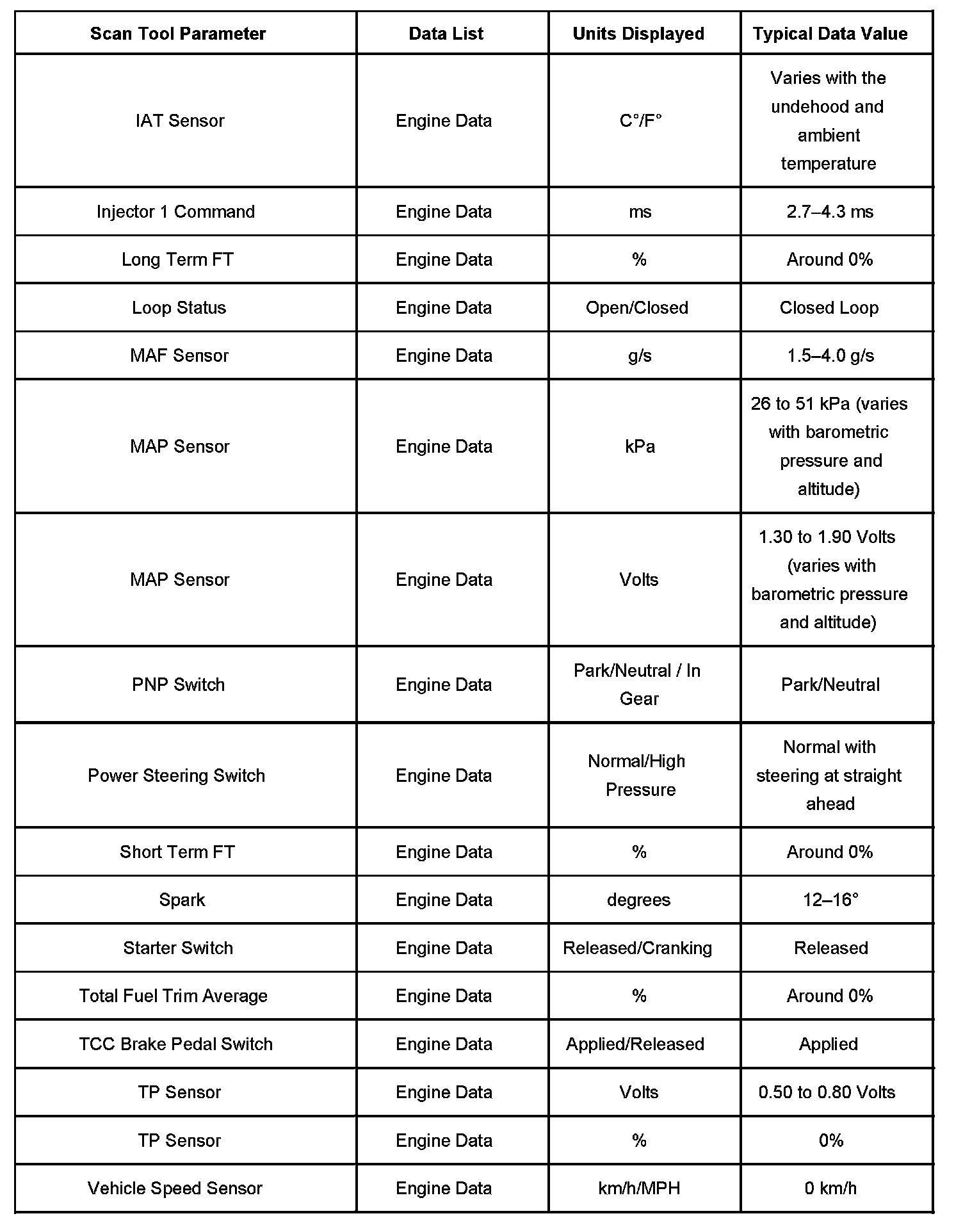 The scan tool values from a correctly operating engine may be used for comparison with the engine you are diagnosing. The values listed in the following table represent typical values that would be seen on a good running engine.
