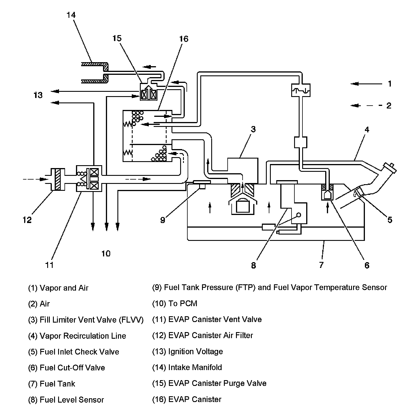 The Evaporative Emission (EVAP) control system limits fuel vapor emissions to the atmosphere. The EVAP system transfers the fuel vapor from a sealed fuel tank to an activated carbon (charcoal) storage device (EVAP canister). The EVAP canister will store the fuel vapors until the engine is able to use them.