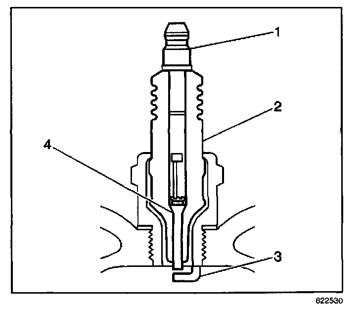 - Measure the gap between the center electrode (4) and the side electrode (3) terminals. Refer to Spark Plug Inspection. An excessively wide electrode gap can prevent correct spark plug operation.