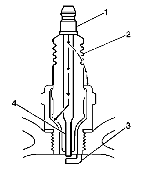 - Inspect for signs of tracking that occurred near the insulator tip instead of the center electrode (4).