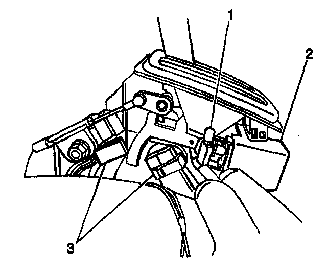 5. Remove the shift lock solenoid connector (3) from under the carpet.
