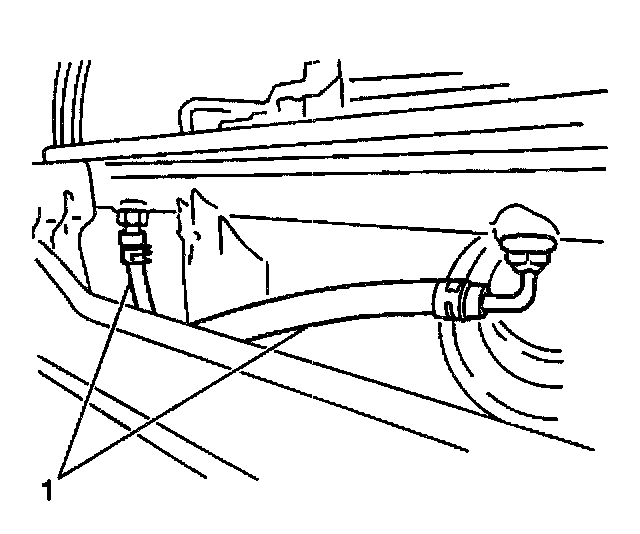 8. Remove the transmission oil cooler lines (1) from the bottom of the radiator (automatic transmission only). Cap the open lines to prevent leakage.