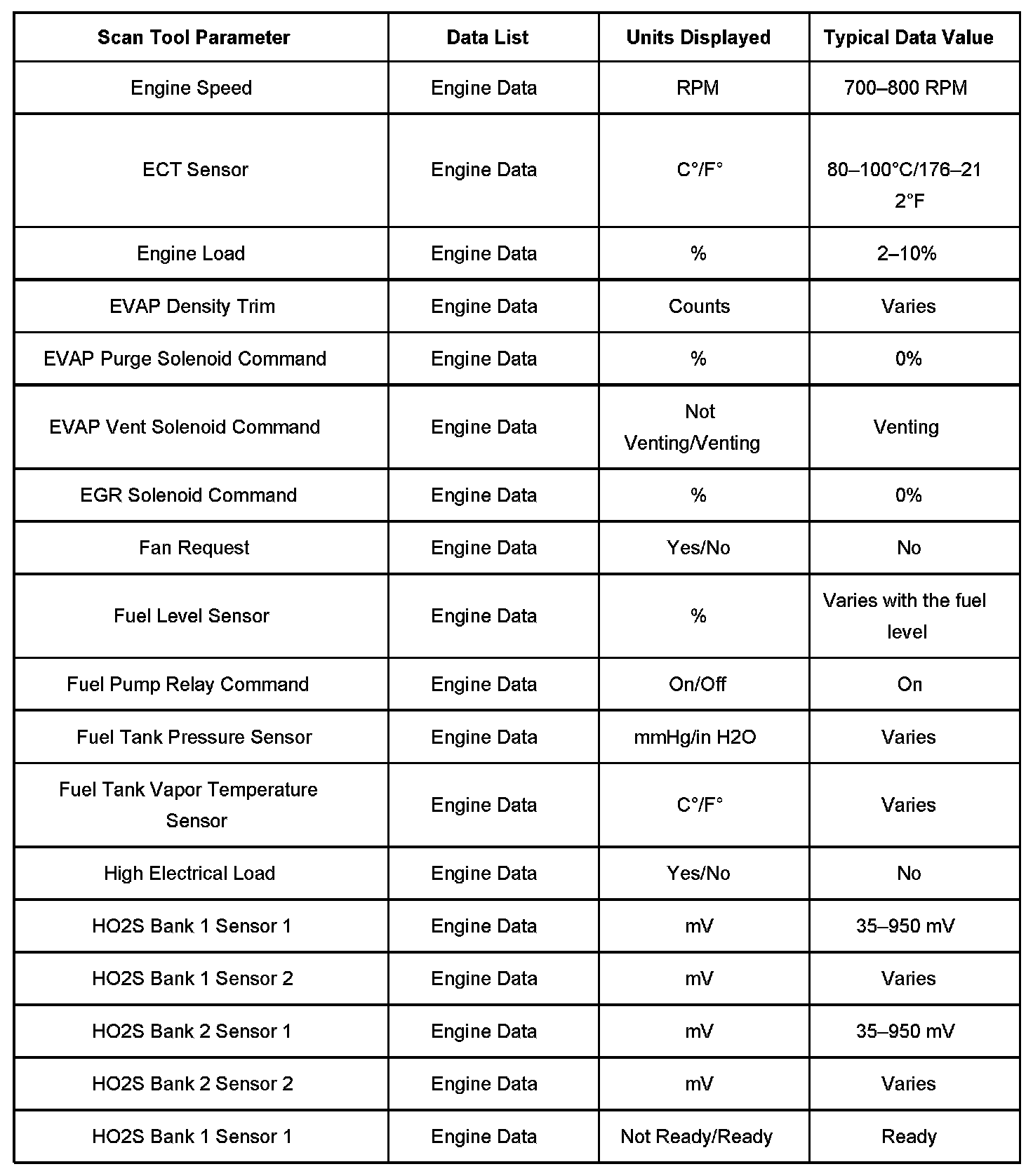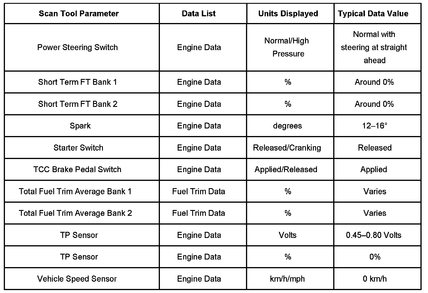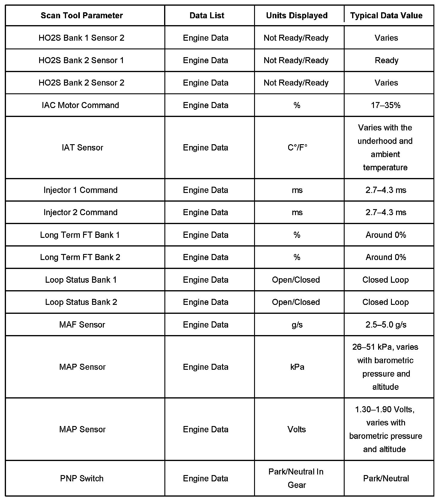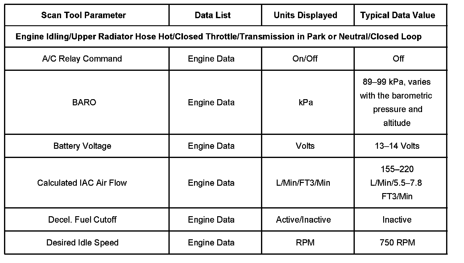 The scan tool values from a correctly operating engine may be used for comparison with the engine you are diagnosing. The values listed in the following table represent typical values that would be seen on a good running engine.
