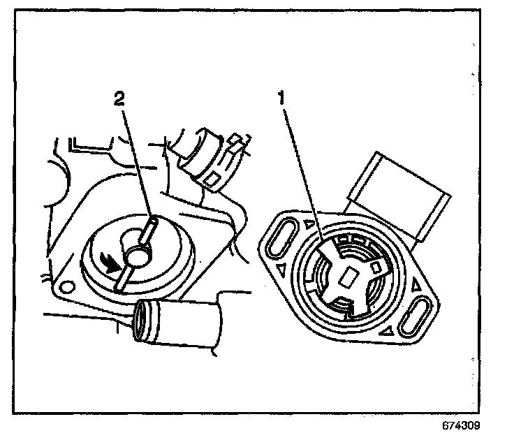 1. Align the throttle shaft pin (2) with the engagement slot (1) of the TP sensor.