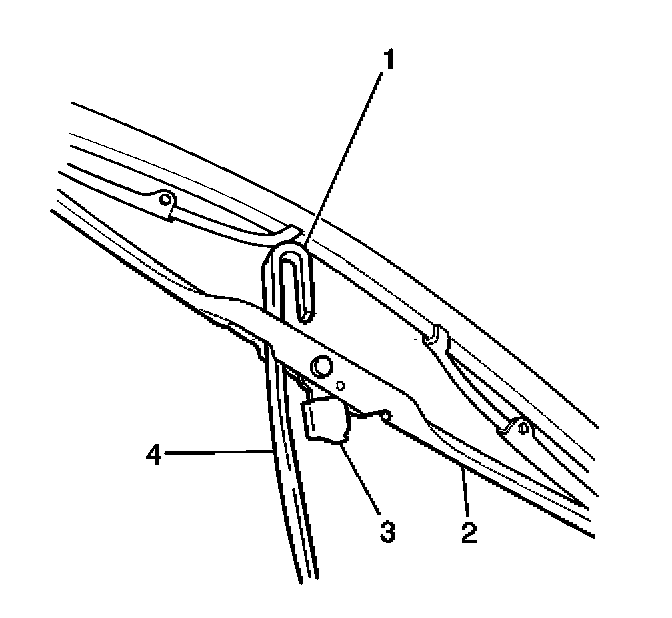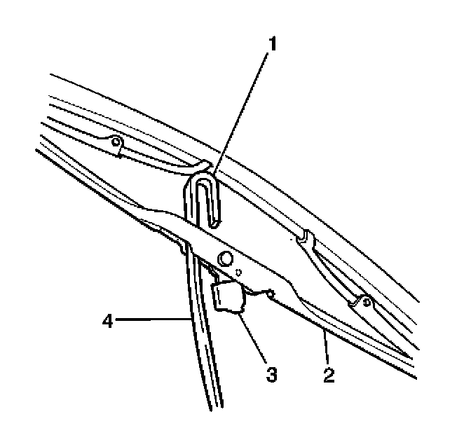 1. Depress the windshield wiper blade retaining tab (3).
