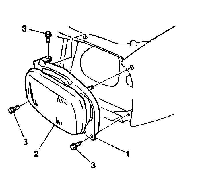 1. Install the headlamp assembly (1,2) to the vehicle. Secure the assembly with the 3 bolts (3).