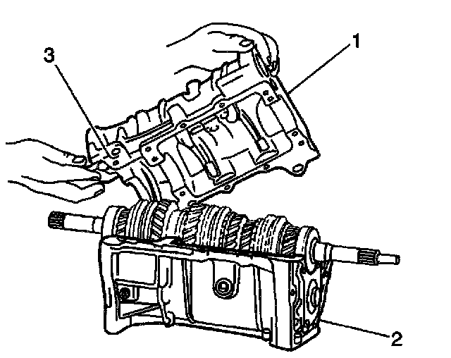 2. Install the main shaft (3) and the input shaft assembly (1) into the lower case (2).