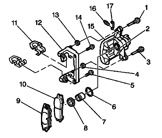 9. Remove the disc brake pad retainers (11) from the disc brake caliper bracket.
