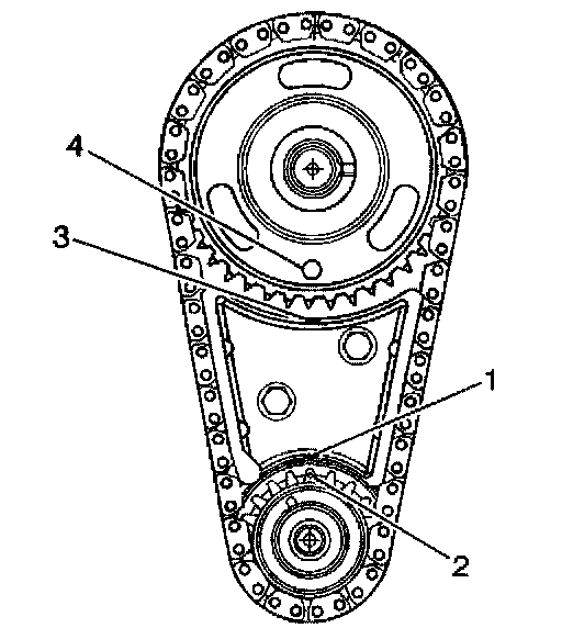 7. Align the timing mark on the camshaft gear (4) with the timing mark on top of the timing chain dampener (3).