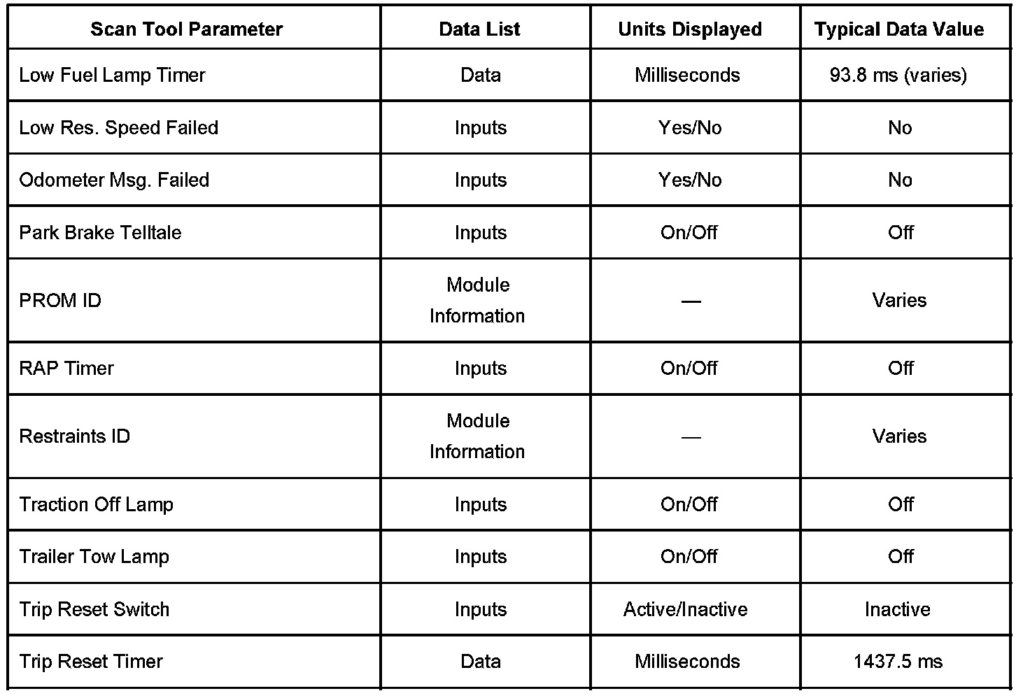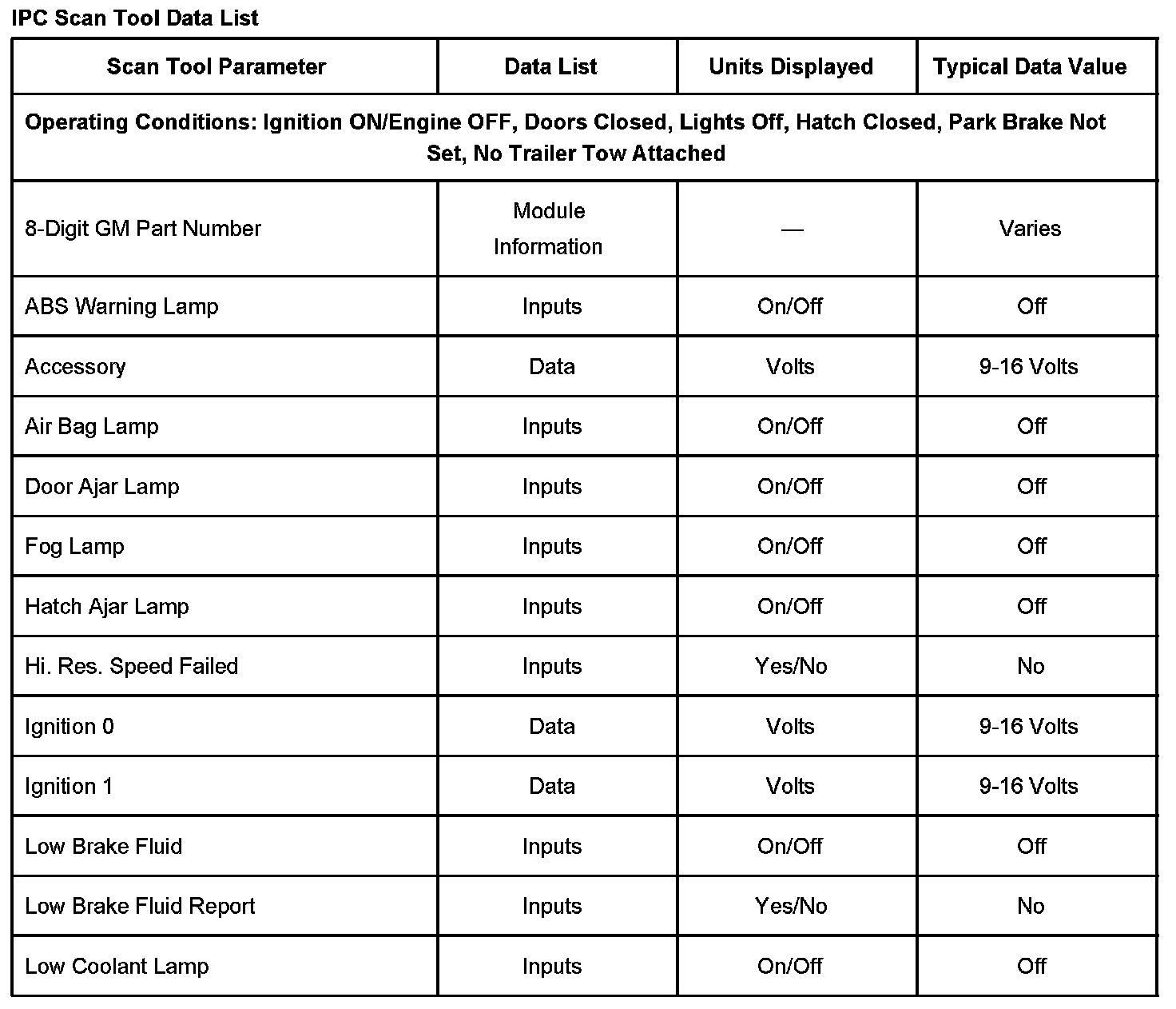 SCAN TOOL DATA LISTThe scan tool data list(s) contain all the instrument panel, gages, and console related parameters that are available on the scan tool. The parameters in the list are arranged in order, as they appear on the scan tool. The data list column indicates the location of the parameter within the scan tool menu selections. Use the scan tool data list(s) as directed by a diagnostic table or in order to supplement the diagnostic procedures. Begin all of the diagnostic procedures with Diagnostic System Check - Instrument Cluster for IPC, Diagnostic System Check - Driver Information Systems for DIC, or Symptoms - Instrument Panel, Gages and Console for audible warnings.