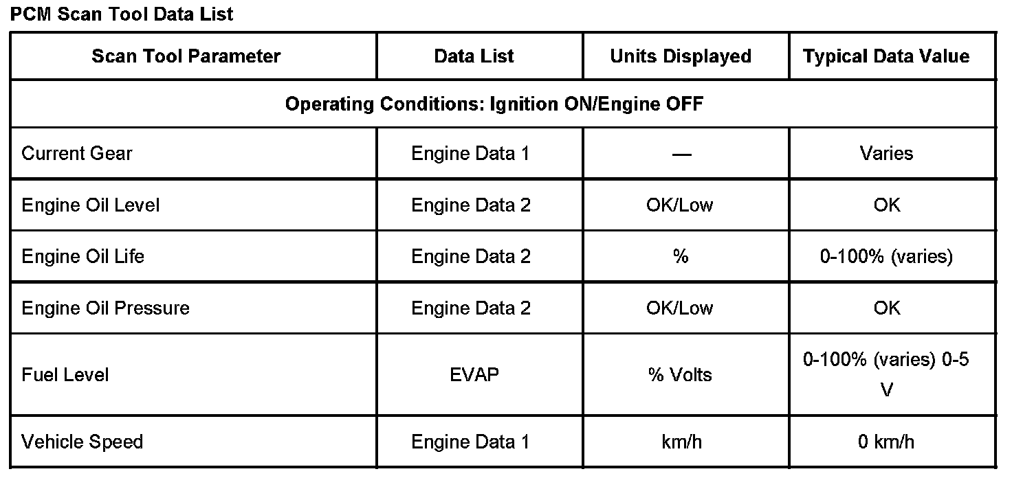 The typical data values are obtained from a properly operating vehicle under the conditions specified in the first row of the scan tool data list table.