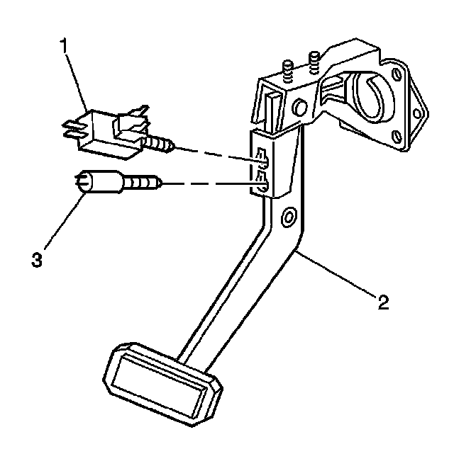1. Insert the stop lamp switch (1) and the cruise control switch (3) if equipped into the brake pedal bracket (2).