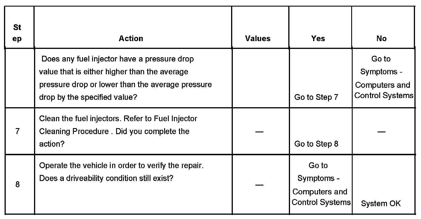 6. If the pressure drop value for each fuel injector is within 10 kPa (1.5 psi) of the average pressure drop value, the fuel injectors are flowing properly.