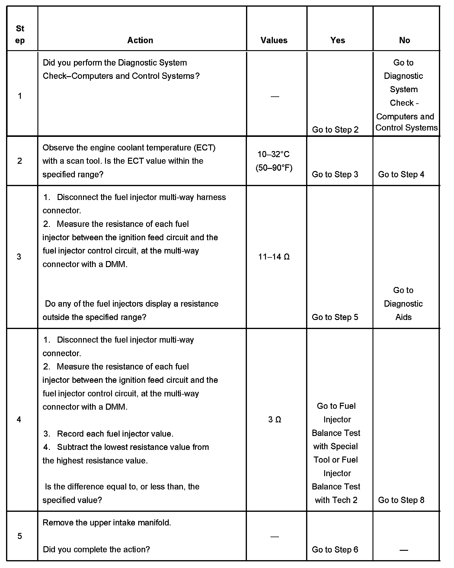 - If the fuel injector coil test does not isolate the condition perform the fuel injector balance test. Refer to Fuel Injector Balance Test with Special Tool or Fuel Injector Balance Test with Tech 2. Component Tests and General Diagnostics Component Tests and General Diagnostics