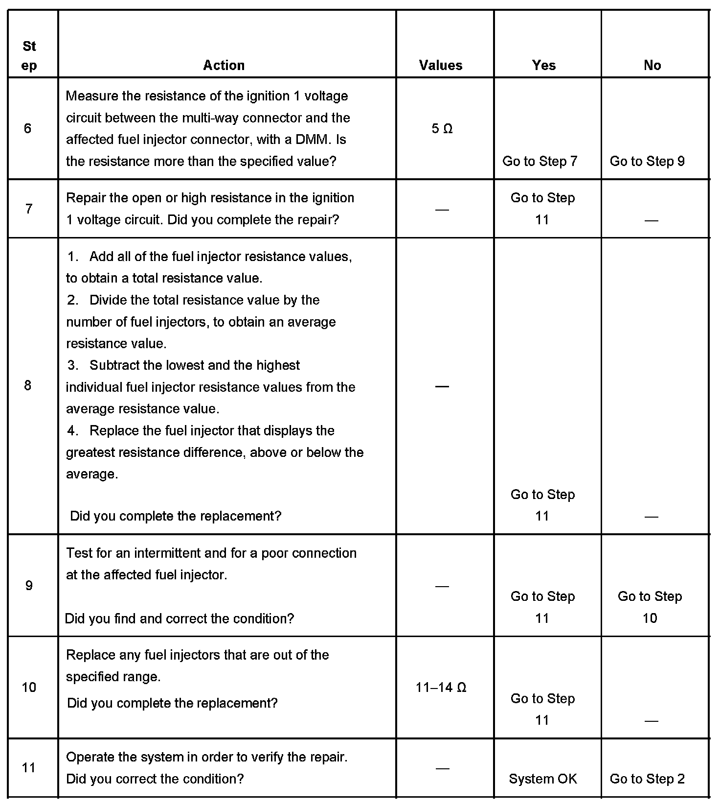 3. This step tests each fuel injector resistance within a specific temperature range. If any of the fuel injectors display a resistance outside of the specified value, replace the fuel injector.