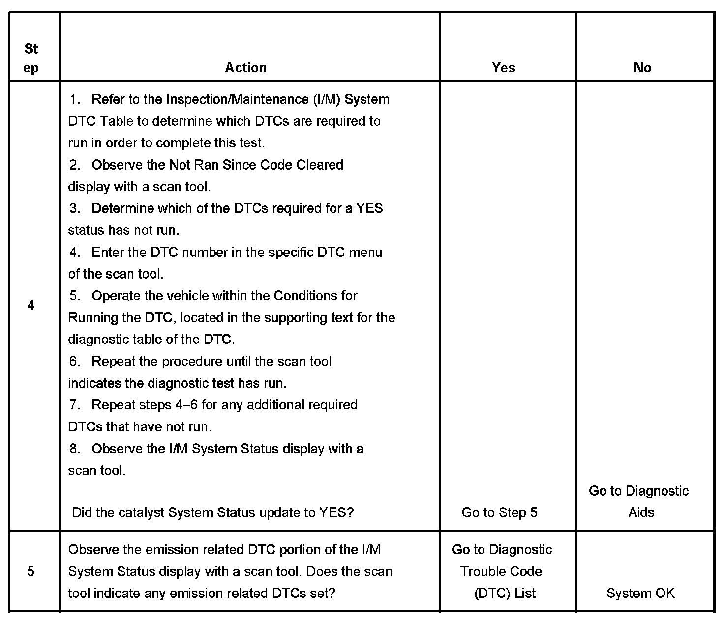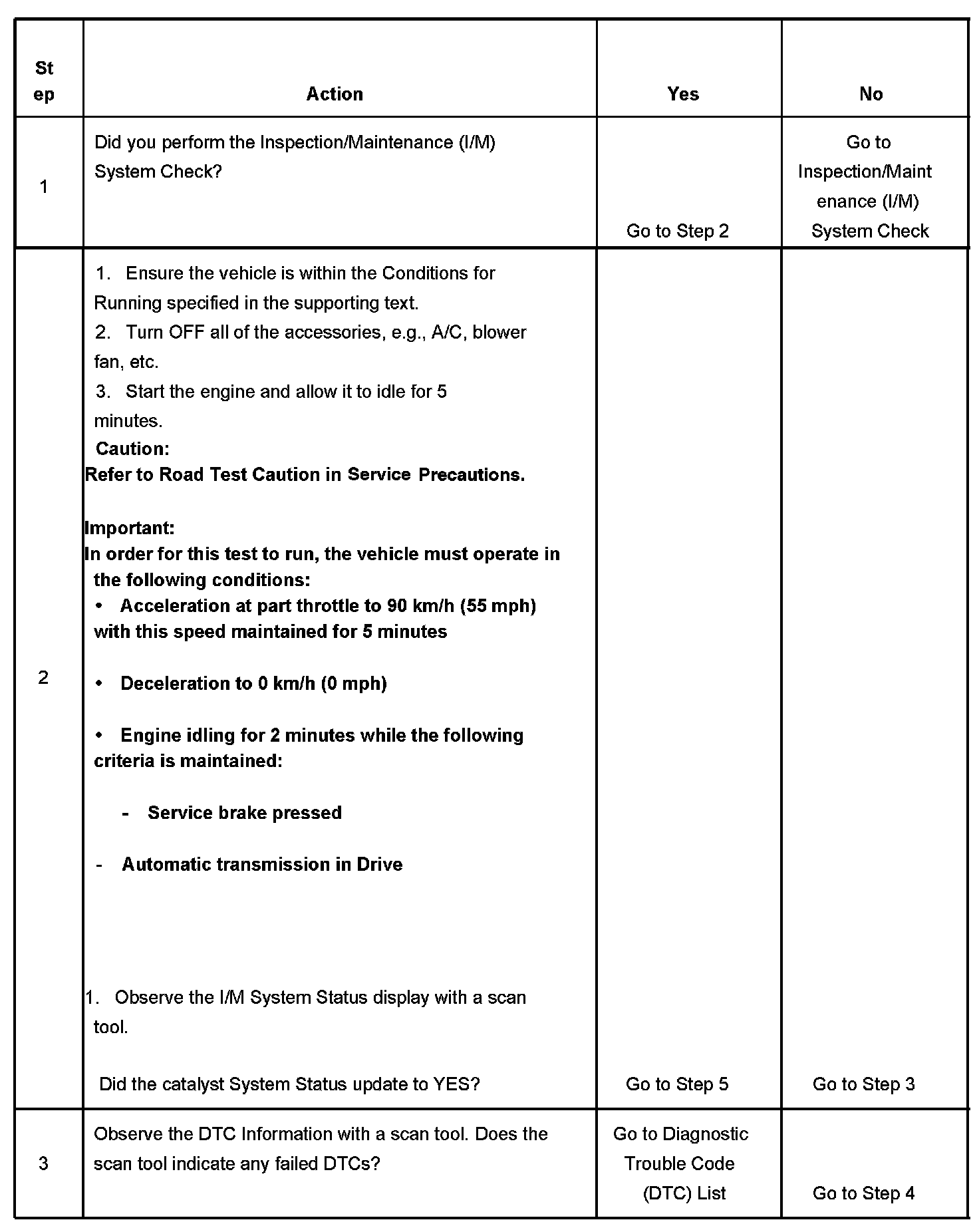 The purpose of this test is to satisfy the enable criteria necessary to execute inspection/maintenance (I/M) readiness diagnostics for the catalyst system. The test may be used to set the I/M System Status indicators to YES. The I/M System Status display on the scan tool provides an indication of whether the control module has completed the required tests. The I/M System Status does not indicate that the tests have passed or failed. When all of the diagnostics for a specific system have run and passed, the I/M System Status will update to YES. If a test for a specific system has failed, the I/M System Status will update to YES, indicating a determination was made even if all of the other tests for that system have not run.