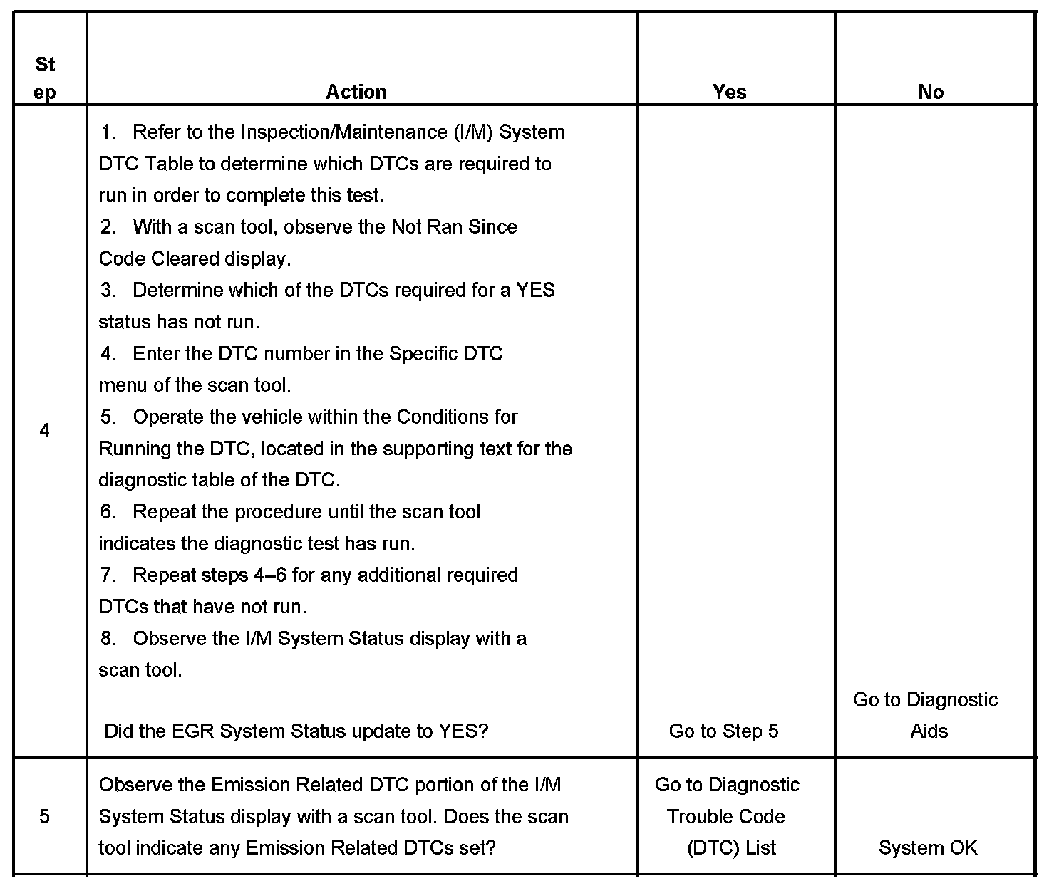 Several deceleration cycles may be necessary in order to accumulate a sufficient number of EGR flow samples. The procedure outlined in the table is for a clear, flat road. If the procedure is performed on a road with a slight down hill grade, the test may acquire the necessary sample counters in one or two decel trips. If the test is interrupted during the procedure, it may take more than three deceleration cycles to complete the test. If the status does not update, the test outlined in this procedure can be repeated until the I/M System Status updates to YES.