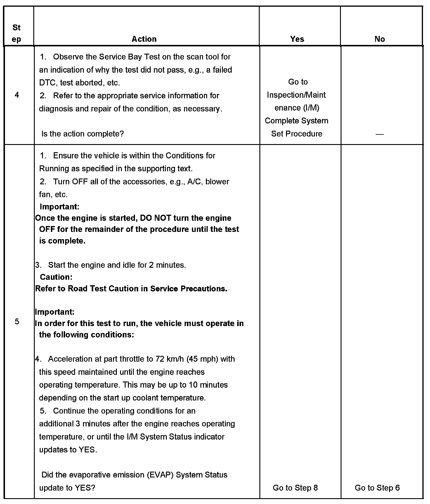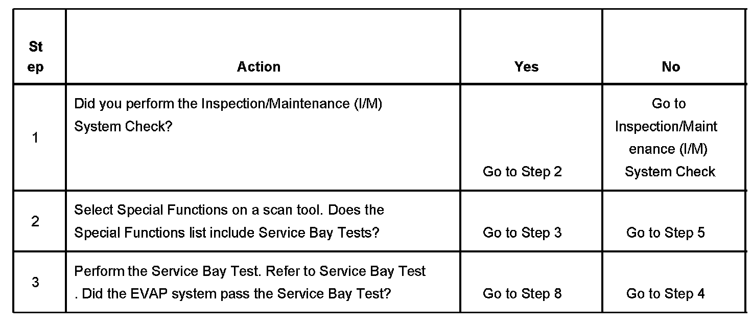 The purpose of this test is to satisfy the enable criteria necessary to execute inspection/maintenance (I/M) readiness diagnostics for the evaporative emission (EVAP) system. The test may be used to set the I/M System Status indicators to YES. The I/M System Status display on the scan tool indicates whether or not the control module has completed the required test. The required test is complete when either all of the DTCs comprising the test have run and passed, or when any one of the DTCs comprising the test has illuminated the malfunction indicator lamp (MIL). Once the test is complete, the I/M System Status display will indicate YES in the completed column. Performing a visual inspection prior to running the EVAP test may prevent having to repeat the test due to the fact that a failed or aborted test will require the vehicle to cool down in order to meet the enable criteria to run another test.