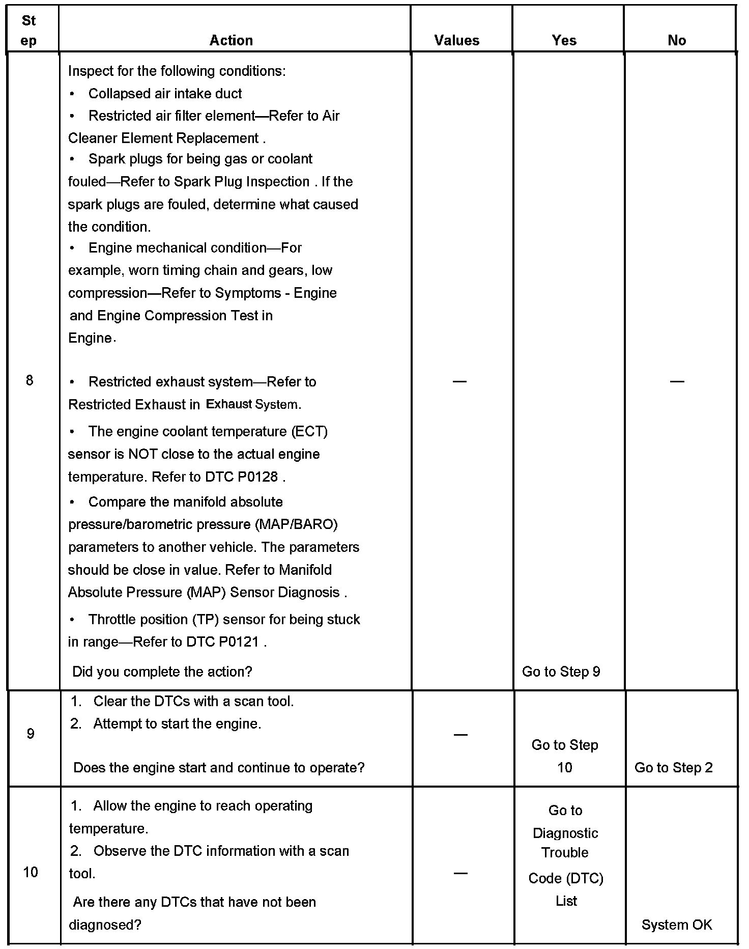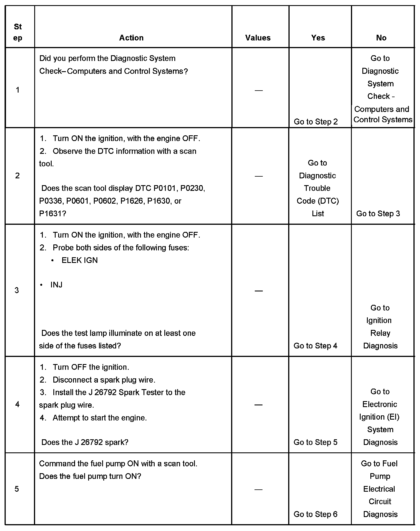 The Engine Cranks but Does Not Run diagnostic table assumes the following: