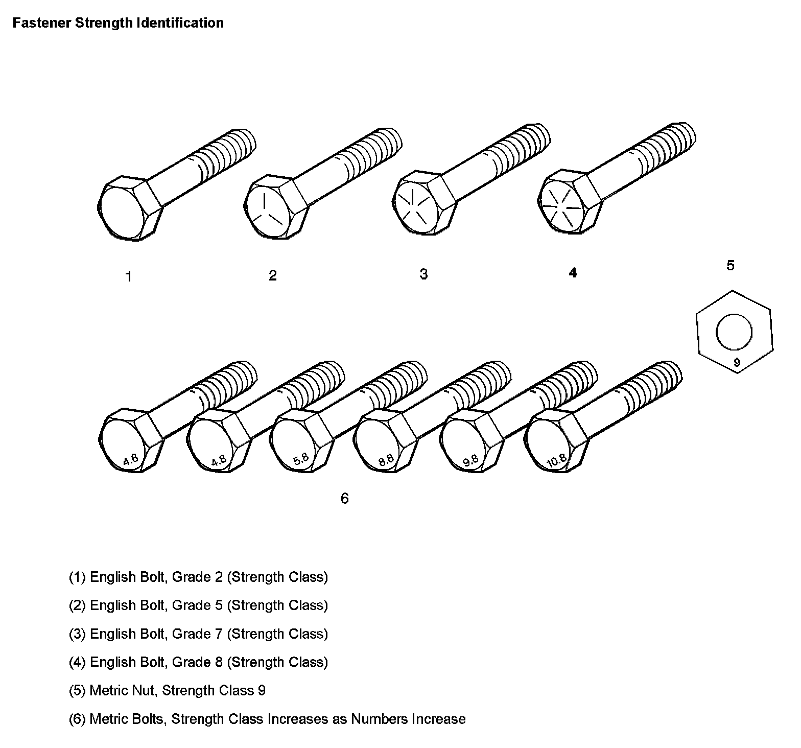 The most commonly used metric fastener strength property classes are 9.8 and 10.9. The class identification is embossed on the head of each bolt. The English, inch strength classes range from grade 2 to grade 8. Radial lines are embossed on the head of each bolt in order to identify the strength class. The number of lines on the head of the bolt is 2 lines less than the actual grade. For example, a grade 8 bolt will have 6 radial lines on the bolt head. Some metric nuts are marked with a single digit strength identification number on the nut face.