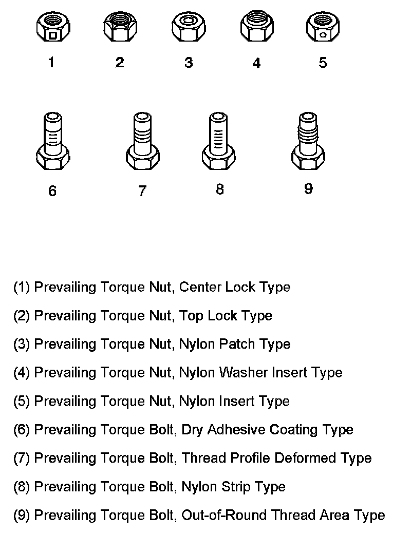 These fasteners accomplish the thread interface by the presence of a thread-locking compound on the fastener threads. Refer to the appropriate repair procedure in order to determine if the fastener may be reused and the applicable thread-locking compound to apply to the fastener.