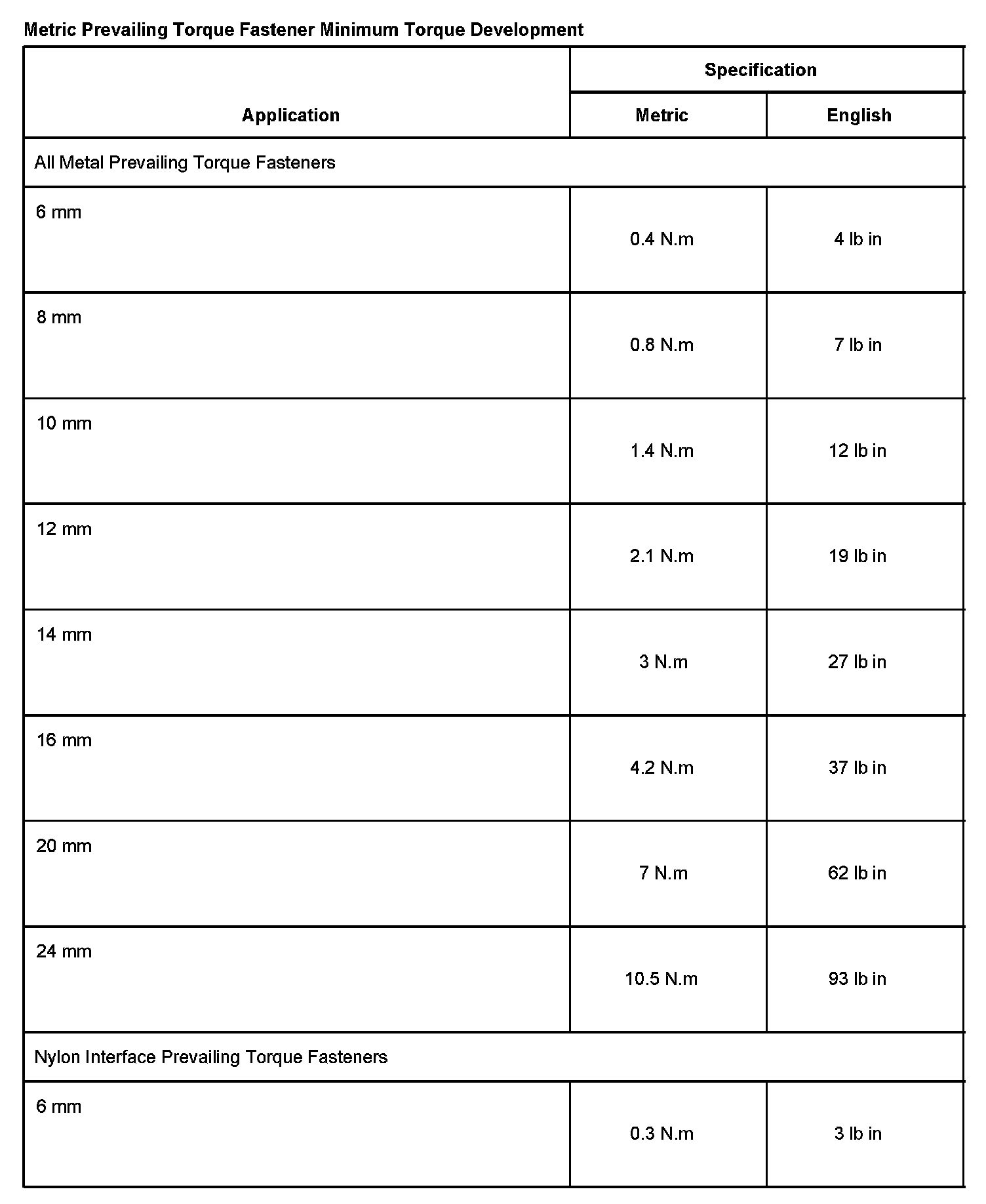 English Prevailing Torque Fastener Minimum Torque Development Part 1: