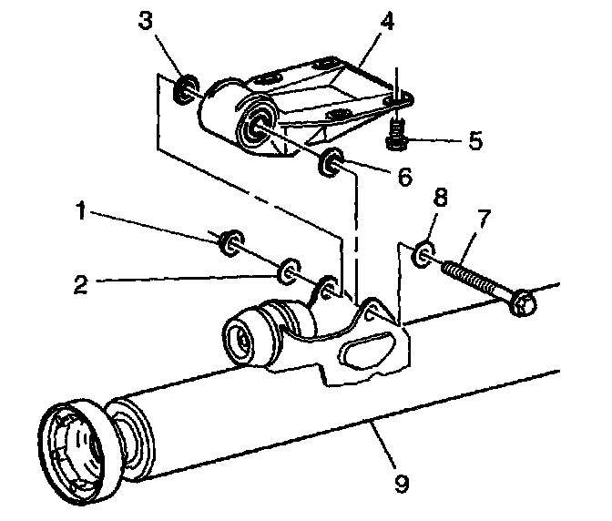 5. Remove the nut (1), bolt (7), washers (2 and 8), and spacers (3 and 6) from the tube (9).