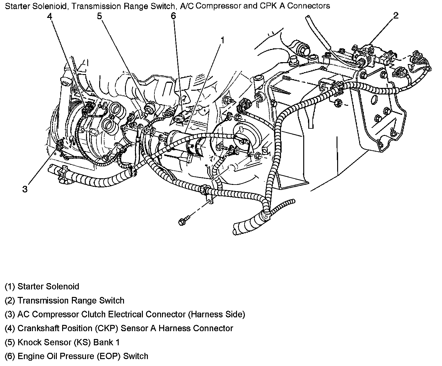 Starter Solenoid, Transmission Range Switch, A/C Compressor and CKP A Connectors: