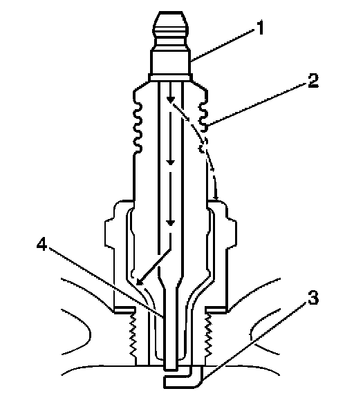 - Inspect the insulator (2) for cracks. All or part of the electrical charge may arc through the crack instead of the electrodes (3, 4).