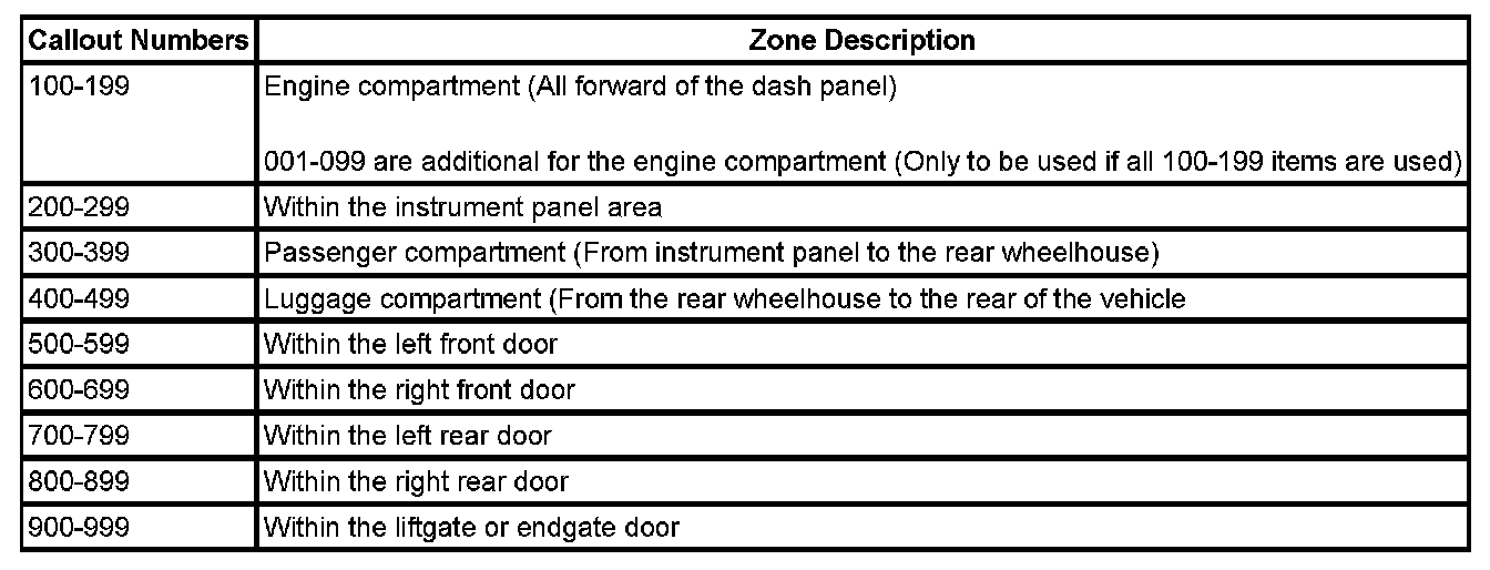 All grounds, in-line connectors, pass-through grommets, and splices have identifying numbers that correspond to where they are located in the vehicle. The following table explains the numbering system.