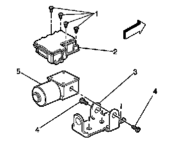 3. Remove the mounting screws (1) that fasten the EBCM (2) to the Brake Pressure Modulator Valve (BPMV) (5).