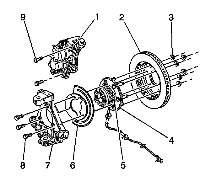 3. Remove the brake rotor (2). Refer to Brake Rotor Replacement - Front.