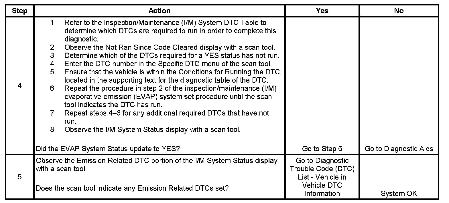 The purpose of this procedure is to satisfy the enable criteria necessary to execute inspection/maintenance (I/M) readiness diagnostics for the Evaporative Emission (EVAP) System. The procedure may be used to set the EVAP I/M System Status display on the scan tool to YES. The EVAP I/M System Status display indicates whether or not the control module has completed the readiness diagnostics. The readiness diagnostics complete when all DTCs comprising the diagnostics run and pass, or any DTC comprising the diagnostics illuminates the malfunction indicator lamp (MIL). If the diagnostics pass during one drive cycle, seventeen hours must elapse, regardless of whether the vehicle is driven or not. Then, the diagnostics will run again during the next drive cycle in which the conditions for running are met. Once the diagnostics have passed during the third drive cycle, the EVAP I/M System Status display will be updated to YES. A failed or aborted diagnostic will require the vehicle to cool down in order to meet the enable criteria for another drive cycle. Therefore, performing a visual inspection prior to running the EVAP test may prevent having to repeat the drive cycle.