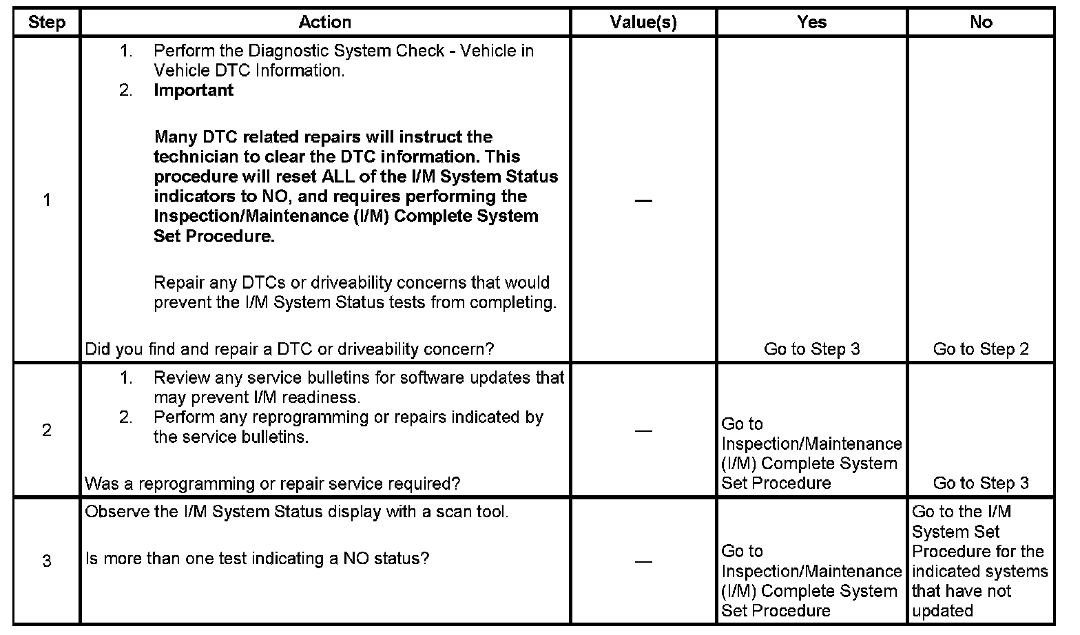 For the specific DTCs required for each system, refer to Inspection/Maintenance (I/M) System DTC Table. Inspection/Maitenance (I/M) System (DTC) Table