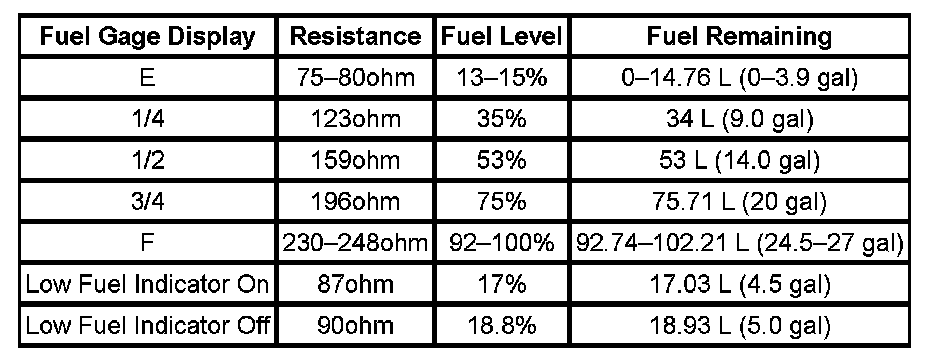 The information in this table is intended for use with the J 33431-C Signal Generator and Instrument Panel Tester. The fuel level sensor values represent the test values to be used on the Signal Generator to drive the fuel gage display to the indicated positions. Vehicles that require more than one fuel level sensor calculate gage position from many possible resistance combinations of fuel levels between the two tanks. Therefore, the values in the table may not correlate directly to readings taken from the vehicle primary or secondary sending units.