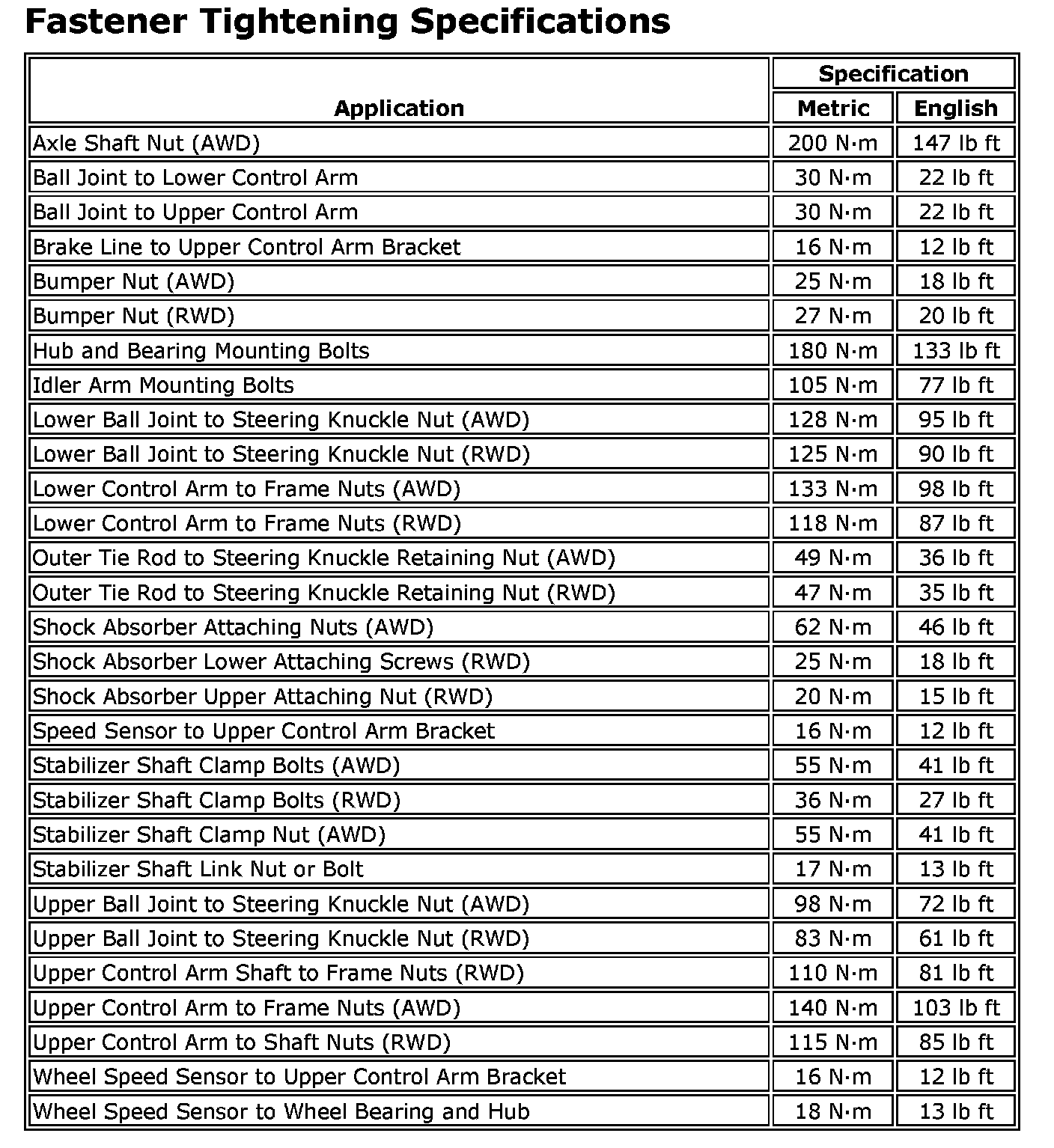 Fastener Tightening Specifications