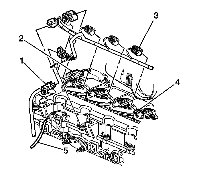 5. Disconnect the engine wiring harness retainer (2) from the camshaft cover (3).