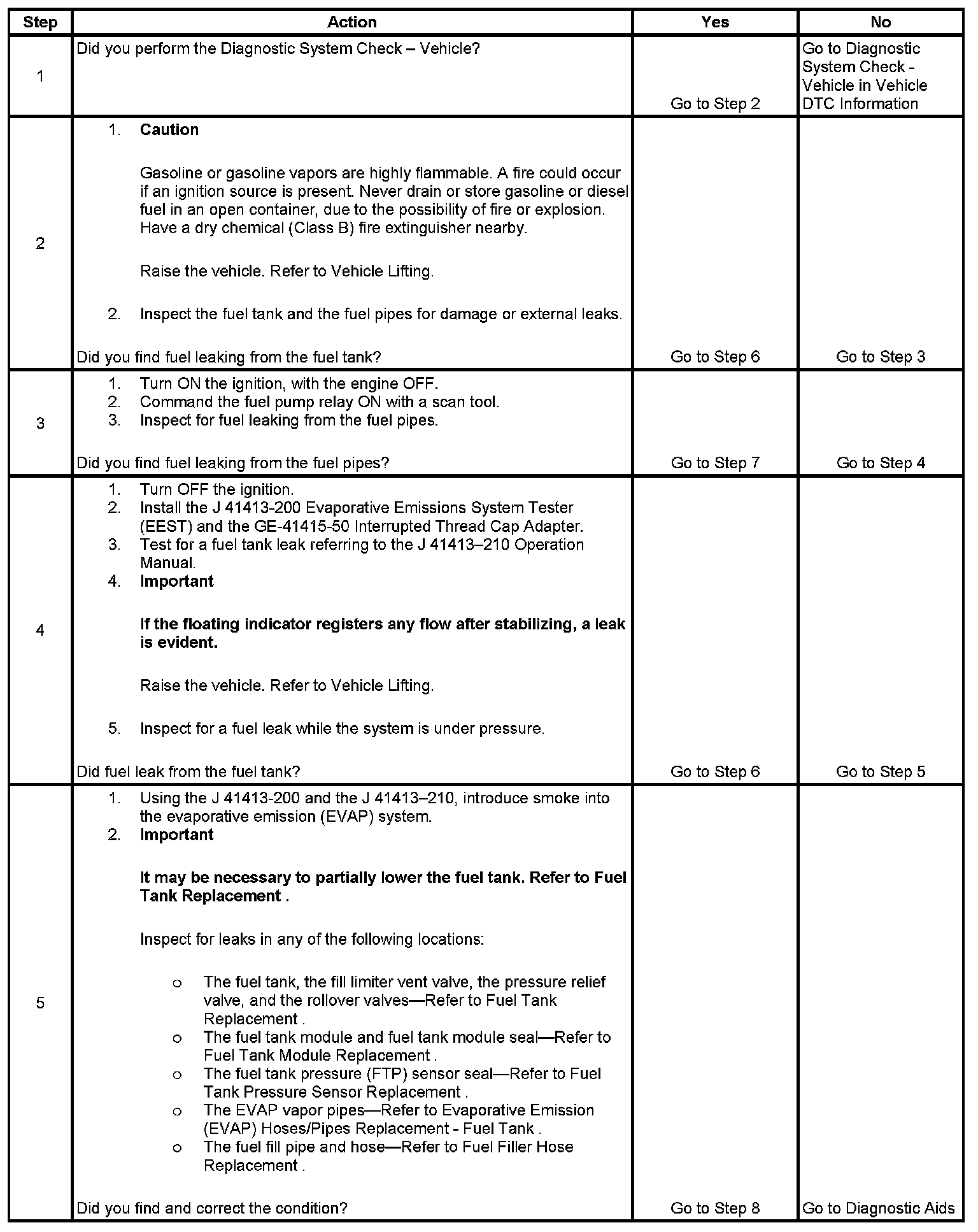 The fuel tank leak test is used to locate any fuel or fuel vapor escaping the fuel tank area. Fuel vapors escaping above the fuel level will be detected, if more than the calibrated amount, when the evaporative emission (EVAP) diagnostics complete one test cycle. The malfunction indicator lamp (MIL) will illuminate after the EVAP diagnostics have failed 2 test cycles.