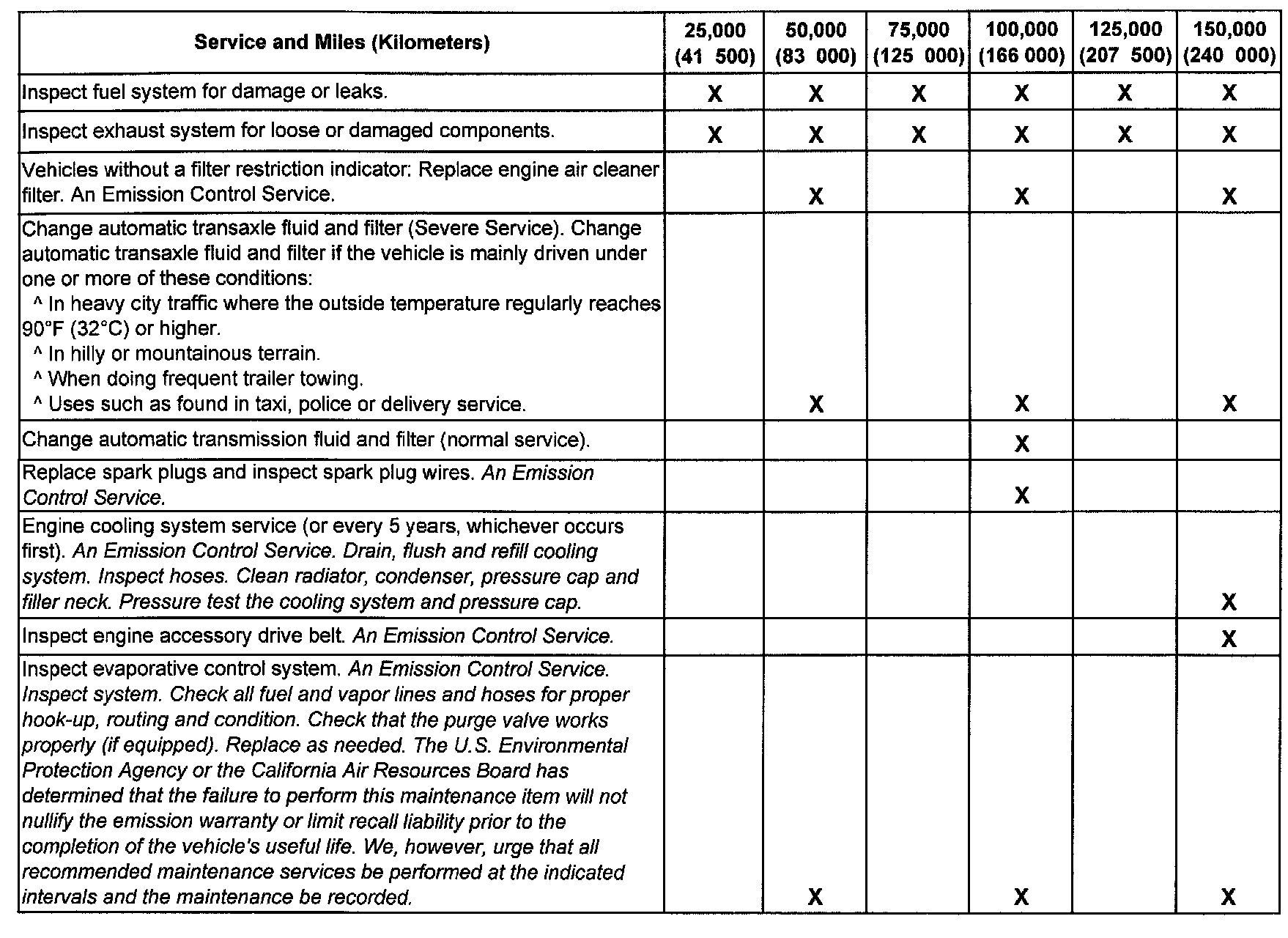 service (I or II) after the indicated miles (kilometers) shown for each item.